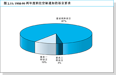 64. 语言涉及到一个职位的总的要求。对P2以上的许多职位要求至少两门语言。图2.11表明1998-99两年度通报的空缺职位85%需要两种语言,3%需要三种语言。此外需要一种语言的职位80%将第二种语言列为理想资格。在招聘时强调语言熟练程度;在确认任命时,可能要求新招聘的工作人员进行有关正式语言-英文、法文、西班牙、阿拉伯或中文的熟练程度考试。对许多在职工作人员来说,语言熟练程度已成为晋升的一项重要标准。
