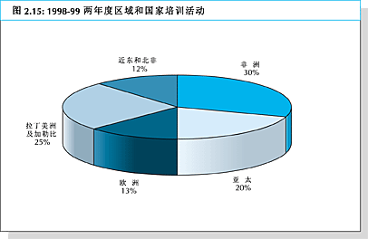 79. 如图2.15所示,非洲是1998-99两年度接受培训援助最多的区域,占30%。拉丁美洲及加勒比和亚太分别接受培训活动的25%和20%,近东及北非和欧洲各占总量的大约12%和13%。