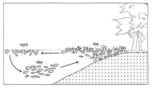 Fig. 38. Pattern of diurnal migrations of fish between macrophyte stands and open water in strongly hypoxic conditions. (From Junk et al., 1997).