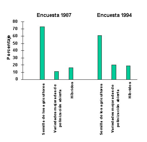 En 1994 el CIMMYT llevó a cabo otra encuesta; una comparación entre ambas se encuentra en la Figura 6. Durante este período el área sembrada con híbridos en los países tropicales subió a 19%, con un incremento de 3%; el área sembrada con variedades de poli-nización abierta subió a 20%, con un incre-mento de 9%, mientras que el área sembrada con semillas de las variedades de los agri-cultores bajó a 61% (CIMMYT, 1994). El con-junto de variedades de los propios agricultores incluía: