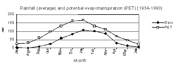 Figure 60. Rain and potential evapotranspiration (PET) (average for 1934-1990) for Nueva Esperanza, Pellegrini Department, Santiago del Estero, Argentina.