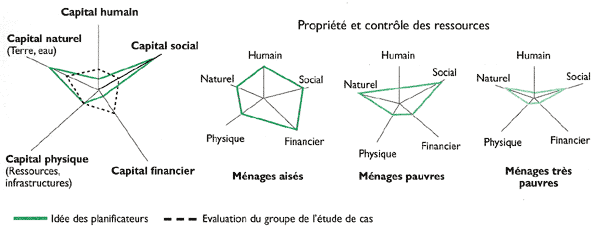 PROBLÈMES POSÉS PAR LE PENTAGONE DES RESSOURCES - GROUPE DE L'ÉTUDE DE CAS DU MALI Le polygone des ressources proposé dans l'approche des moyens de subsistance durables a cinq côtés: le capital naturel, le capital physique, le capital financier, le capital humain et le capital social. En essayant d'appliquer ce pentagone, le groupe de l'étude de cas du Mali s'est aperçu que la perception des concepteurs du projet différait de celle du groupe d'étude et qu'il fallait trois pentagones, un pour chaque catégorie socio-économique. De plus, il était difficile de combiner plusieurs dimensions d'un même type de capital sur le même axe. L'infrastructure physique régionale et communautaire tenait difficilement sur le même axe que les ressources du ménage. Comment noter le capital naturel sur un seul axe alors que la terre abonde mais qu'elle est de qualité médiocre? Comment noter le capital humain lorsque le niveau de santé et d'éducation est faible mais que la main d'uvre est disponible en abondance? Lorsque nous évaluons le capital social comme étant élevé, moyen ou faible, à quelle aune devons-nous le mesurer (les régions du pays, le monde)?