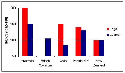 – Lower transport costs; road and rail charges have dropped by half since 1984, and New Zealand now has the lowest port charges for log exports.