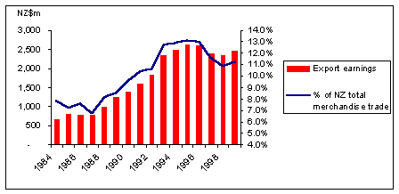 Statistics are incomplete, but the number of export markets for lumber has increased from two (Australia and Japan) in 1984, to seven in 1999. Greatest development has been in the United States and Taiwanese market, 37 percent of our lumber exports by value in 1999.
