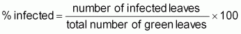 Look closely for diseases in each sampling area on each visit and as you walk between sampling areas. First identify the diseases. To estimate the percentage of the crop that is infected, walk diagonally across the field and collect 50 shoots as you go. If the field is 50 metres across, pick a sample at every stride. From the collection, count the total number of green leaves, and the number of green leaves with a particular infection. Calculate the percentage of infected green leaves in the 50 shoot sample for each disease present as: