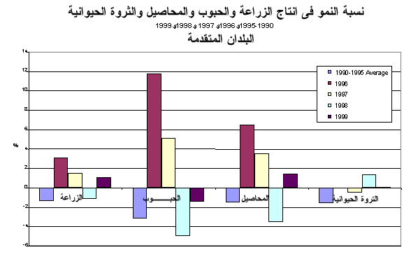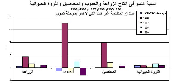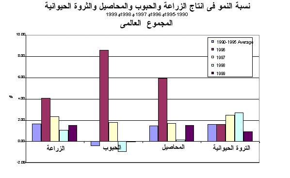 1 - تشير التقديرات الأولية إلى أن الإنتاج المحصولي والحيواني في العالم قد زاد بنسبة 1.6 في المائة في 1999. ويمثل ذلك تحسنا طفيفا عن معدل النمو الذي كان سائدا في 1998 على الرغم من أنه أقل مما كان عليه في 1996 و1997، فإنه يقترب من المتوسط البالغ 1.7 في المائة خلال الفترة 1990-1995. وزاد مجموع الانتاج المحصولي بنسبة 1.5 في المائة في حين ظل انتاج الحبوب دون تغيير بعد أن انخفض بنسبة 1 في المائة في 1998. ولم يزد الانتاج الحيواني إلاّ بنسبة 0.9 في المائة مقابل 2.7 في المائة في 1998. وتبين هذه التطورات، بدرجة كبيرة، الوضع في البلدان المتقدمة حيث انخفض انتاج الحبوب خلال العامين الأخيرين، ولم تحقق المحاصيل عموما سوى زيادة طفيفة في 1999 بعد أن انخفضت بنسبة 3.5 في المائة في 1998. غير أن البلدان النامية شهدت أيضا تباطؤا في معدل النمو الزراعي الذي انخفض عن 2 في المائة في 1999.