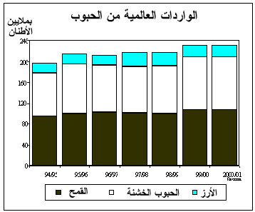 12 - من المنتظر لحجم التجارة العالمية بالحبوب فى 2000/2001 أن يبقى مقاربا لنظيره الكبير نسبيا فى العام السابق بحدود 232 مليون طن. ومن المنتظر أن يصل حجم التجارة العالمية بالقمح ودقيق القمح (بما يعادله من الحبوب) فى 2000/2001 (يوليو/تموز - يونيو/حزيران) الى 107.5 مليون طن، أى أن يزيد على نحو طفيف فوق مستوى نظيره فى العام السابق، مسجلا بذلك أعلى مستوى على الاطلاق، بما يعكس بالدرجة الأولى الزيادة الكبيرة فى واردات البلدان النامية. ففى آسيا، من المنتظر أن تعود الصين (الجزء القارى) الى الأسواق الدولية للقمح هذا العام بصفتها أكبر مشتر للقمح، وذلك يعزى الى انخفاض مستوى انتاجها. وفى أفريقيا، قد يزيد مجموع واردات الاقليم لأسباب تعزى بالدرجة الأولى الى زيادة حجم الشحنات الموجهة الى أفريقيا الشمالية، حيث أدى الجفاف الى تخفيض الانتاج، وأدى الى زيادة كبيرة فى حجم الطلب الاستيرادى فى بعض البلدان مثل الجزائر والمغرب. أما مجموع واردات أوروبا فمن المنتظر أن تكون بدرجة أقل هذا العام لاسيما نظرا للانخفاض الحاد فى واردات الاتحاد الروسي. ومن المنتظر أن تزيد على نحو طفيف واردات بلدان أمريكا اللاتينية والبحر الكاريبى مقارنة بمستواها في العام السابق، الأمر الذى يعزى بالدرجة الأولى الى قوة الطلب فى البرازيل.