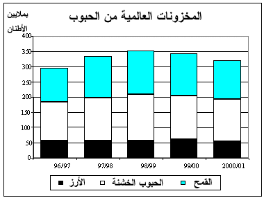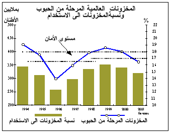 21- من المنتظر أن تصل المخزونات العالمية من الحبوب لدى نهاية المواسم المحصولية في 2001 إلى 320 مليون طن، وهو رقم يقل بمقدار 22 مليون طن أو بنسبة 6 في المائة دون مستوى المخزونات في بداية المدة. وعلى مستوى التوقعات الراهنة فإن نسبة المخزونات العالمية المرحلة من الحبوب إلى اتجاه الاستخدام في 2001/2002 سيصل إلى 16.5 في المائة أو ما يقل على نحو طفيف دون نسبة 17 إلى 18 في المائة التي تعتبرها أمانة المنظمة بمثابة الحد الأدنى الضروري للحفاظ على الأمن الغذائي العالمي. وعلى الرغم من احتمال أن ينخفض مجموع مخزونات الحبوب على الصعيد العالمي هذا الموسم إلا أن عددا من المؤشرات يوحي بأن المخزونات المتاحة لدى البلدان المصدرة الرئيسية كافية لتلبية أية زيادة غير متوقعة في الطلب العالمي على الحبوب هذا العام. ومن المنتظر أن يزيد الرقم التجميعي للمخزونات المتاحة من الحبوب لدى البلدان المصدرة الرئيسية للقمح والحبوب الخشنة والأرز هذا الموسم بمقدار 8 ملايين طن على الأقل لتصل إلى 156 مليون طن، وذلك على الرغم من انخفاض مخزونات الصين وهي من البلدان المصدرة الرئيسية للأرز في العالم. وعموما، فإن التوسع المحتمل في مخزونات الحبوب لدى البلدان المصدرة الرئيسية قد يرفع نصيبها بنسبة تقارب 49 في المائة من المجموع العالمي، مقارنة بنسبة 43 في المائة في الموسم السابق.