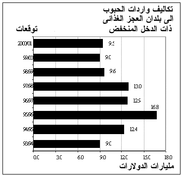 38 - واستنادا الى توقعات اجمالى الواردات فى 2000/2001، وبالأخذ فى الحسبان آفاق المعونة الغذائية من الحبوب وتوقعات الأسعار خلال موسم 2000/2001، ينتظر أن تصل تكاليف واردات الحبوب الى البلدان النامية، الى ما يناهز 22 مليار دولار، أى بزيادة مليار دولار عن العام الماضى، ولكنها تقل كثيرا عن المستويات العالية التى شهدتها خلال الفترة بين 1994 و1997، عندما زادت أسعار الحبوب عن مستوياتها فى السنوات الأخيرة. وبالنسبة لبلدان العجز الغذائى ذات الدخل المنخفض، يقدر أن يبلغ اجمالى حجم وارداتها من الحبوب فى 2000/2001 نحو 74 مليون طن، وهو ما يزيد بمقدار مليون طن عن العام الماضى. ويعزى ذلك، بصورة رئيسية، الى احتمال زيادة واردات العديد من البلدان الأفريقية. وتشير التقديرات الى أن بلدان العجز الغذائى ذات الدخل المنخفض، كمجموعة، تصل الى 9.5 مليار دولار، بزيادة 500 مليون دولار، أو 5 فى المائة، عن 1999/2000، ولكنها تقل كثيرا عن مستوياتها فى منتصف التسعينات عندما بلغت ذروة تناهز 17 مليار دولار. ومن المحتمل أن يؤدى الارتفاع، فى الآونة الأخيرة، فى قيمة الدولار مقابل معظم العملات الأخرى، الى ارتفاع تكاليف الواردات محسوبة بالعملات المحلية.