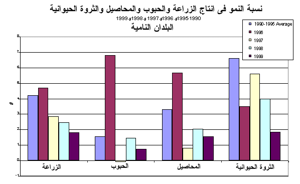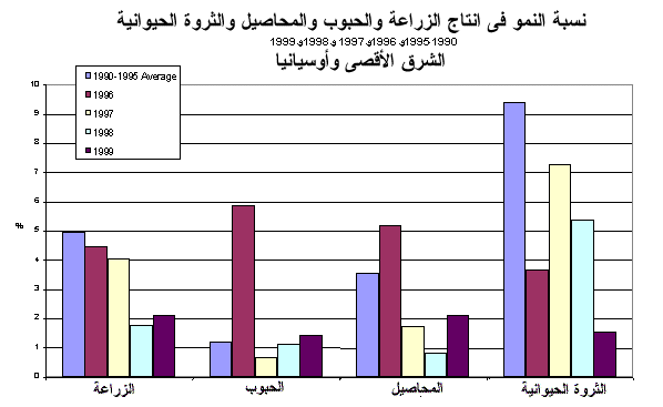 2 - وزاد الإنتاج الزراعي في الشرق الأقصى وأوسيانيا بنسبة 2.1 في المائة في 1999 حيث زاد زيادة طفيفة عن 1.8 في المائة في 1999 إلاّ انه يقل عن المعدل الذي يزيد على 4 في المائة الذي تحقق خلال الفترة ما بين 1990-1997.