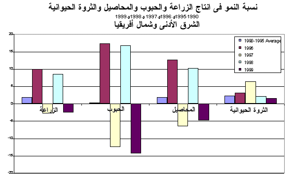 4 - وفي إقليم الشرق الأدنى وشمال أفريقيا، تسبب الجفاف في انخفاض الإنتاج الزراعي بنسبة 2.5 في المائة في 1999. ويتعرض الإقليم، وخاصة شمال أفريقيا، لتقلبات شديدة في الإنتاج الزراعي حيث كان عاما 1996 و1998 من أفضل السنوات من ناحية النمو، في حين شهد عاما 1997 و1999 انخفاضا في الإنتاج. وتعرض أكبر بلدين منتجين وهي تركيا وجمهورية إيران الإسلامية للجفاف وانخفض الإنتاج بنسبة 1.9 و5.4 في المائة على التوالي في 1999. كما أدت الأحوال الجوية المعاكسة إلى حدوث انخفاض شديد في الإنتاج في العراق والأردن والمغرب وسورية. ومن ناحية أخرى، سجلت تونس ومصر زيادات كبيرة في الإنتاج تصل إلى نحو 6 في المائة.