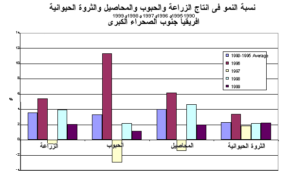 5 - ولم يزد الإنتاج الزراعي في أفريقيا جنوب الصحراء الكبرى إلاّ بنسبة 2 في المائة في 1999 منخفضا بذلك عن معدل عام 1998 البالغ 3.9 في المائة. وحصدت بلدان السهل محصولا قياسيا من الحبوب للعام الثالث على التوالي في حين تضرر إنتاج شرق أفريقيا بشدة من الجفاف وعدم انتظام الأمطار في حين تعرضت بعض المناطق في جنوبي أفريقيا للأمطار المفرطة أو لموجات ممتدة من الجفاف. وزاد الإنتاج في نيجيريا التي تعد أكبر بلد منتج في الإقليم بنسبة 3.9 في المائة بعد أن سجلت زيادة بنسبة 8.9 في المائة في 1998. وسجلت معدلات نمو تزيد على 5 في المائة في كل من بينان وغينيا الاستوائية وغامبيا وغانا وليسوتو وملاوى وراوندا، وساو تومي وبرنشيبي والسنغال وسيشيل وزامبيا. غير أن الجفاف و/أو عدم انتظام الأمطار في الكثير من بلدان شرق أفريقيا أديا في 1999 إلى تعرض أكثر من 16 مليون نسمة، وخاصة الرعاة، لعجز غذائي شديد. وأسهمت الصراعات الأهلية أو الحرب في إحداث انخفاض شديد في الإنتاج في كل من أنغولا وجمهورية الكونغو الديمقراطية وأريتريا وسيراليون.