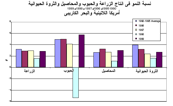 6 - وارتفع معدل النمو في الإنتاج الزراعي في أمريكا اللاتينية والبحر الكاريبي إلى 2.9 في المائة في 1999 بعد أن كان 1.6 في المائة في 1998. وشهدت كل من البرازيل وإكوادور والسلفادور وغويانا وبيرو زيادات بنحو 5 في المائة مما يشكل تحسنا كبيرا عما كان عليه الوضع في 1998 عندما تضرر الإنتاج من الكوارث الطبيعية التي وقعت في العديد من بلدان أمريكا الوسطى والجنوبية. وزاد إنتاج المكسيك الزراعي بأكثر من النسبة المتواضعة البالغة 2.2 في المائة في حين ركد الإنتاج في الأرجنتين بعد الزيادة الكبيرة البالغة 8.8 في المائة في 1998. وتقلص الإنتاج الزراعي في بوليفيا والجمهورية الدومينيكية وغواتيمالا وسورينام بنحو 5 إلى 10 في المائة، في حين انخفض بنسبة تقدر بأقل من 2 في المائة في شيلي وكولومبيا وهندوراس وأوروغواي.