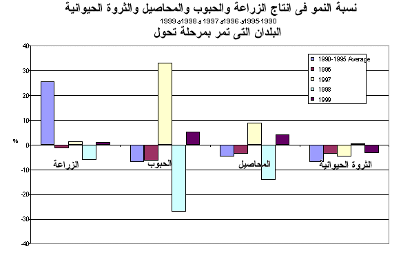 3 - ففي الصين، أدى الجفاف الشديد وانخفاض المساحة المزروعة نتيجة للأسعار غير المواتية إلى تباطؤ النمو في الإنتاج الزراعي حيث وصل إلى 1.6 في المائة في 1999. وفي الهند، انتعش الإنتاج بعد تقلصه بنسبة 0.5 في 1998 وزاد بمعدل 4.4 في المائة في 1999، وأدت الأحوال الجوية الجيدة في الولايات المنتجة الرئيسية الى تحقيق محصول قياسي من القمح. وزاد الإنتاج في كمبوديا ولاو وماليزيا وميانمار، والفلبين وفيتنام بما يتجاوز 4 في المائة في 1999. وعلى الرغم من أن هذا المعدل قد عوض الإنتاج المنخفض أو السلبي في السنة السابقة في معظم البلدان، فقد كان ذلك بالنسبة للاو وعلى وجه الخصوص فيتنام استمرارا لفترة من النمو المرتفع المتواصل. وشهدت جمهورية كوريا الديمقراطية الشعبية زيادة في الإنتاج تفوق 4 في المائة في عام 1999 وذلك للعام الثاني على التوالي. غير أن ذلك جاء بعد معدل انخفاض سنوي يبلغ نحو 4 في المائة فيما بين 1990 و1997. وحققت بنغلاديش وتايلند نموا بنسبة 2.9 و 2.3 في المائة على التوالي. واستقر الإنتاج الزراعي في إندونيسيا في 1999 بعد انخفاض بنسبة 2.4 و1.8 في المائة في 1997 و1998 على التوالي. وانخفض إنتاج باكستان بنسبة 0.8 في المائة في 1999 بعد أن زاد بنسبة 5.8 في المائة في 1998.