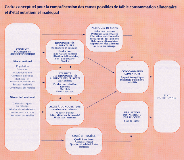L'insécurité alimentaire est un phénomène complexe, imputable à une gamme de facteurs qui varient en importance selon les régions, les pays et les groupes sociaux, ainsi que dans le temps (voir figure). Ces facteurs peuvent être regroupés en quatre ensembles représentant autant de domaines de vulnérabilité potentielle: