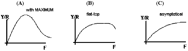Notice that in every model presented, S=0 implies R=0, as expected and the slope of the tangent to the curve at that point, (0,0), is equal to the parameter α. Sometimes, the relations S-R are presented as R/S in function of S, so the Beverton and Holt equation would be: