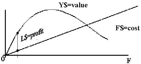 Figure 4.6 Long-term relations between the value of the catch, the cost of exploit- ation and the profit against the fishing level