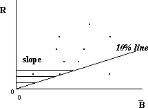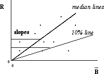 As seen in Section 4.5 the slope (B/R) of each line marked in the graph, is associated with a certain value of the fishing level, F. The value of F associated with the median line is then, the median target point, Fmed.