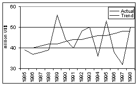 Exports have fluctuated sharply over the 10 years 1985-1998, during which they have been only on a slightly rising trend. In the initial year (1985) they had the same value as in the final year (Figure 1); their average value in 1995-98 (US$94.6 million) was 32 percent lower than in 1990-94 and 34 percent lower than the extrapolated trend value (Table 6).