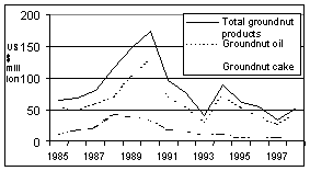 Agricultural exports represent around one fifth of total exports and are constituted predominantly by groundnut products (oil of groundnut, cake of groundnut, shelled groundnut) (52 percent of the value of total agricultural exports in 1998). Over time, this dominance has changed in favour of other products or groups of products such as cotton (21 percent), fruit and vegetables (8 percent) and hides and skins (3 percent).