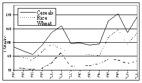 Figure 6 shows how food imports have varied annually in relation to total agricultural exports. The ratio has risen almost constantly over the period 1985-1998 and particularly during the last four years of the period. Food imports were on average 4.2 times as much as agricultural exports in 1995-98, which was 72 percent more than in 1990-94 and 38 percent more than the extrapolated trend ratio. There has thus been a worsening of the agricultural trade balance, particularly in 1995-98.