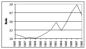 Figure 6: Ratio of the total value of food imports to that of agricultural exports, 1985-98