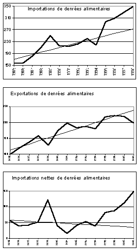 La figure 1 montre l'évolution des échanges agricoles de 1985 à 1998 et la tendance jusqu'en 1994, (extrapolée jusqu'en 1998). L'ensemble des importations agricoles totales a augmenté rapidement de 1985 à 1994, au taux linéaire de 10 millions de dollars E.-U. par an. Après 1994, elles ont augmenté fortement (36 pour cent) en 1995 et ont continué à progresser (de 3 à 12 pour cent) au cours des années successives. C'est pourquoi la valeur moyenne des importations de 1995 à 1998 était de 50 pour cent supérieure au niveau de la période 1990-94 et de 26 pour cent supérieure à la valeur de la tendance extrapolée, bien que la tendance ait été fortement positive (tableau 3).