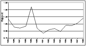 La figure 3 indique les variations des importations alimentaires par rapport aux exportations agricoles totales. De 1985 à 1987, le rapport était de 1,02 (les importations alimentaires équivalaient pratiquement aux exportations agricoles). A l'exception de 1989, année au cours de laquelle le rapport a grimpé à 1,41, la tendance du rapport a été négative de 1985 à 1994. Sa valeur moyenne, de 1995 à 1998 était de 1,07, quelque 17 pour cent de plus par rapport à la période 1990-94 (0,92) mais 25 pour cent de plus par rapport à la tendance. Autrement dit, on a assisté à une accentuation nette et évidente du déficit entre les importations alimentaires totales et les exportations agricoles totales, de 1995 à 1998 par rapport aux quatre années précédentes, et ce mouvement est encore plus fort en regard de la tendance.