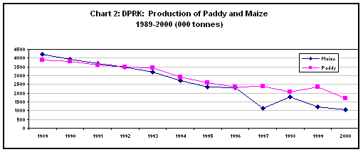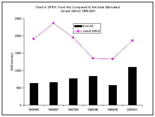 This year's drought also affected neighbouring China and a number of other countries in central and south Asia and the Middle East. The knock-on effects, however, are perhaps more ominous in DPR Korea as the country can essentially produce food during only one season in the year (June-Oct.), has chronic input problems in the agricultural sector and is already in the midst of serious and persistent food shortages. Consequently, with no real possibility of enhancing food supplies significantly through domestic production till the next harvest in September/October 2001 and limited resources to import food commercially, the country appears to have little alternative other than to rely heavily on food assistance during the next 12 months, as it has done for the last five years.