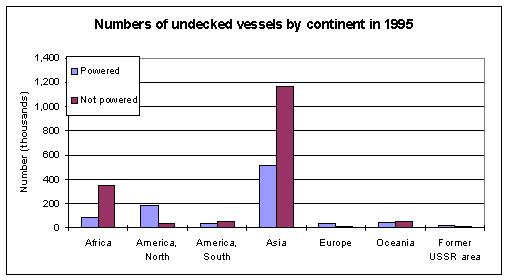 The bulk of the fleet in the developing countries is made up of small, often undecked and unmotorized vessels. As Figure 3 shows, more than four out of five undecked vessels are either in Asia or Africa.48 These proportions did not change markedly during the dramatic increase in the undecked fleet, which grew by about 60% or one million vessels from 1970 to 1995.
