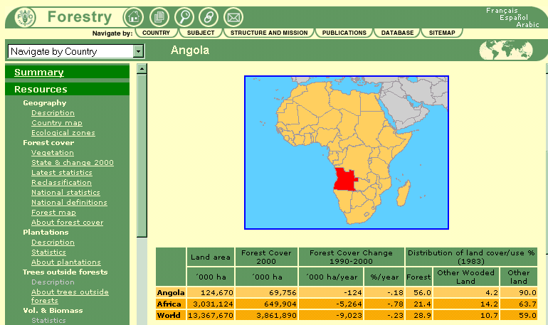 Figure 4. Dynamically loaded country profiles on forests and forestry constitutes a major output of FRA 2000. The profiles are available to the public through the FAO website at www.fao.org/forestry/fo/country/nav_world.jsp.