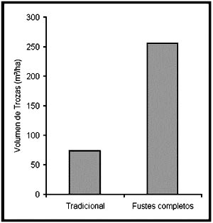 Figura 1. Comparación del volumen maderable sin corteza para los sistemas de aprovechamiento tradicional y de fuste completo.