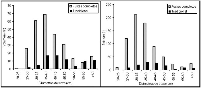 En el sistema de fuste completo se aprovecha la pieza en su totalidad, desde la base hasta punta del fuste, trozándolo luego en la cancha de acopio, por lo que el volumen aprovechable es mayor y se caracteriza por un mayor número de trozas de menor diámetro (Figura 2). Mediante el método de fuste se cuadruplicó el volumen aprovechado por el método tradicional. Los rendimientos globales obtenidos en este estudio son comparables a otros estudios realizados en Argentina (Daffunchio y Villena 1997; Martínez-Pastur et al. 2000c) y en Chile (González 1995; Garib 1996), siendo posible aplicarlos económicamente a gran escala.