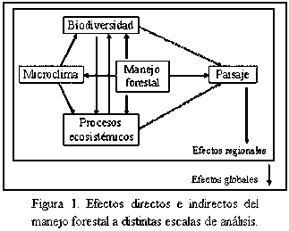 Sin embargo, todas las actividades desarrolladas en ecosistemas naturales pueden afectar directa e indirectamente la biodiversidad, el microclima y los procesos ecosistémicos (Figura 1), influyendo nivel de paisaje, regional y global. El ordenamiento de los bosques, mediante modificaciones en composición y dinámica, provoca la homogeneización de la estructura forestal perdiéndose microambientes propios de bosques prístinos, fragmentación (Christensen y Emborg 1996) y a modificación de los ciclos y disponibilidad de nutrientes (Caldentey et al. 2001). Esto genera problemas en la dinámica poblacional, pudiendo provocar la extinción de determinadas especies. Por ello, el principal problema al que se enfrenta la silvicultura es la pérdida de biodiversidad y de conservación de los ecosistemas boscosos. En estos bosques australes se han llevado a cabo numerosos estudios aislados sobre flora y fauna, así como sobre el clima y sus modificaciones debidas al manejo forestal. Sin embargo, poco se sabe del efecto del aprovechamiento sobre el ecosistema en su conjunto, la función de los sectores no productivos respecto de los aprovechables y su vulnerabilidad frente a las alteraciones del entorno. En este trabajo se analizan conjuntamente el impacto del manejo forestal en la diversidad de algunos componentes de los bosques productivos de Nothofagus pumilio y las relaciones de los mismos con los ambientes asociados.