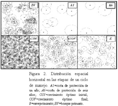 Antes de la intervención el bosque presenta un dosel cerrado, pocos individuos sobremaduros de grandes dimensiones, densidad completa y alto volumen comercial. La corta deja pocos individuos, improductivos, de gran diámetro y dosel abierto, y algunos caen posteriormente por efecto del viento, reduciéndose el área basal y el volumen. Cuando la regeneración crece forma un brinzal (comunidad densa de 1-2 metros de altura) que cierra el dosel, con gran mortalidad debido al autorraleo. Posteriormente, se llega al envejecimiento con una estructura homogénea, coetánea y densa, con alta proporción de individuos maderables y elevada cobertura de copas. En la Figura 2 se muestra la distribución espacial horizontal en cada etapa del ciclo de manejo (Lencinas et al. 1998).