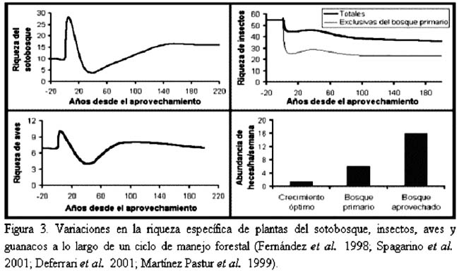 En los vertebrados (aves y guanacos) el impacto es bajo, ya que la riqueza no se modifica a lo largo del ciclo de manejo. La diversidad avícola aumenta luego de la intervención por el ingreso de especies de otros ambientes cercanos, y disminuye cuando la estructura se cierra, ya que el diámetro pequeño de los árboles no permite nidificar y dificulta la alimentación, caza, vuelos y actividades sociales. Finalmente se retoman los niveles del bosque primario cuando la masa forestal madura, ya que dichas especies no tienen elevados requerimientos específicos y se adaptan con relativa facilidad (Deferrari et al. 2001). En cuanto a los guanacos, los bosques aprovechados ofrecen mejores condiciones para su alimentación y protección, mientras que los bosques cerrados son desfavorables. Esto se corresponde altamente con la oferta alimenticia del sotobosque, y ocasiona daños en la regeneración (Martínez Pastur et al. 1999).