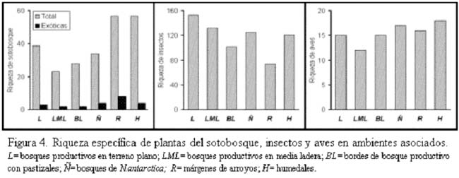 Importancia de los ambientes asociados: A pesar de ser relegados en evaluaciones de Impacto Ambiental o Planes de Manejo, ocupan áreas importantes (30-50% de los bosques) y poseen una flora y fauna características. La Figura 4 presenta la riqueza específica de los organismos estudiados.