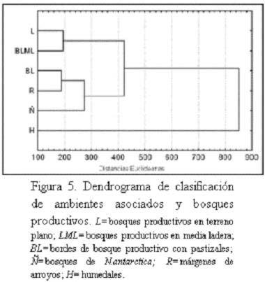 El sotobosque de los ambientes asociados alberga todas las especies observadas en los bosques productivos, presentándose habitualmente con mayores frecuencias, coberturas, abundancias y biomasas, e incluyendo a otras exclusivas, resultando en una mayor diversidad (Rivero et al., 2000a, 2000b; Lencinas et al. 2001a). En humedales, donde el nivel del agua fluctúa, abundan dicotiledóneas e inferiores, mientras que cuando la apertura natural del dosel es mayor, como en bosques de N. antarctica y en el límite con pastizales o turbas, aumentan las monocotiledóneas. Las exóticas tienen poca importancia en los bosques productivos, pero se destacan en humedales y márgenes de arroyos, desde donde colonizan otros rodales. Los insectos presentan mayor riqueza de morfoespecies en los bosques productivos, aunque su abundancia varía con la época del año y el ambiente evaluado. Sin embargo, existen especies exclusivas en todos los bosques, siendo las de los productivos más vulnerables al manejo forestal (Lencinas et al. 2001b). La diversidad de aves varía poco en los ambientes asociados respecto de los productivos, aunque se observa mayor riqueza en humedales y en bosques cercanos a pastizales, y mayor densidad en bosques de N. antarctica, variando marcadamente según calidad de sitio, horario y época del año (Medina et al. 2000a, 2000b). En general, las especies no son exclusivas de un ambiente, pero se vinculan íntimamente a alguno de ellos, o presentan patrones de desplazamiento durante el día, utilizando al bosque para alimentarse por la mañana y otros ambientes para protegerse por la tarde. La clasificación mediante técnicas multivariadas clarifica las relaciones entre ambientes, siendo el humedal el que por su biodiversidad más se diferencia del resto, donde se agrupan el resto de ambientes y los bosques productivos, de acuerdo a su homogeneidad interna (Figura 5) (Lencinas et al. 2001c).