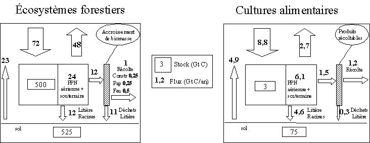 Les forêts ont un fort potentiel de stockage de carbone, notamment vis-à-vis d'autres écosystèmes (cultures ou pâturages). Figure 2, les stocks (Gt C), sont exprimés d'après Batjes (1999) et les flux annuels (Gt C/an) sont calculés d'après la séquence de conversion de l'énergie déjà présentée. Les arbres stockent simultanément dans les sols et la biomasse aérienne, dans des proportions comparables. Leurs taux de respiration sont élevés: environ 2/3 du carbone capté par PPB est rejeté par respiration.