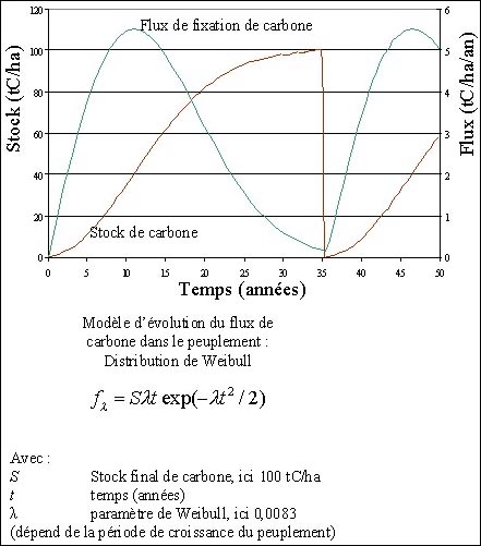 La Figure 3 présente les évolutions du stock de carbone et du flux de fixation dans un peuplement du pin des Landes (pin maritime ou pinus pinaster). Le modèle de croissance est basé sur une distribution de Weibull (Porté et Bartelink, 2002).