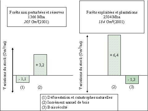 La Figure 4 dresse un bilan des ressources forestières mondiales: les stocks et leurs variations annuelles par modification des surfaces et accroissement du matériel sur pied, en ne considérant que le gros bois (données: FAO, 2001). Ce bilan est élaboré avec des hypothèses à affiner: incrément annuel de bois proportionnel aux surfaces, surfaces et stocks calculés globalement grâce aux densités de bois données par la FAO.