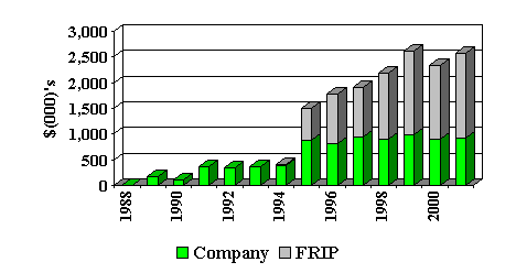 Figure 1. Weldwood direct and FRIP-sponsored research, 1988-2001. The Alberta Forest Resource Improvement Program (FRIP), funded by forest industry contributions, supports research and other activities that are not the regulatory responsibility of forest industry