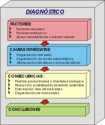 La siguiente etapa la constituyó el diagnóstico de detalle de la situación de la desertificación en la comunidad autónoma, para lo cual se estructuró la información a analizar según el esquema de la Fig.1.