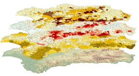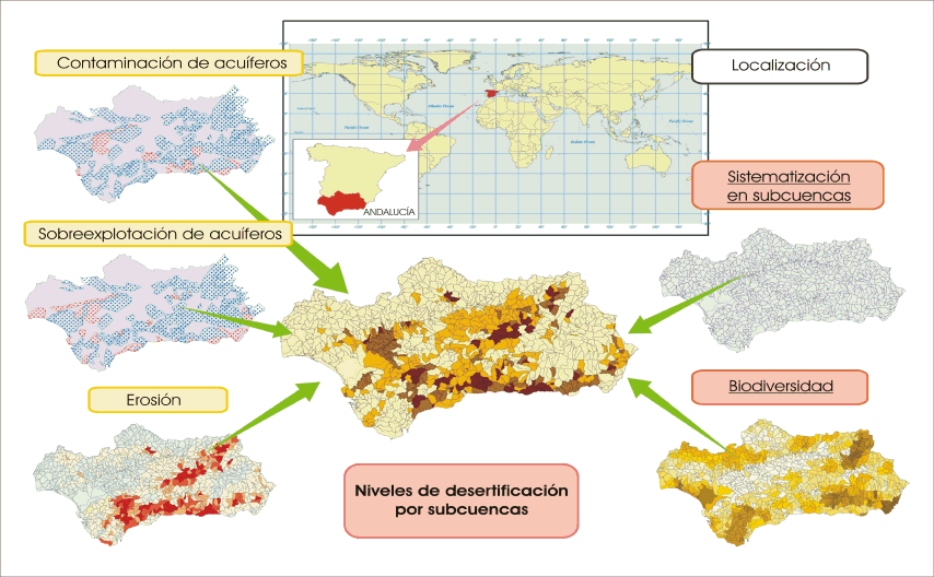 Como complemento al análisis anterior se ha realizado una traducción geográfica del mismo, esto es, se ha obtenido la distribución de las distintas variables de análisis sobre el territorio. Para ello, se han utilizado las herramientas que proporcionan los Sistemas de Información Geográfica para el análisis territorial aplicadas sobre los datos que proporciona la Red de Información Ambiental de Andalucía. Se han sistematizado las distintas evaluaciones en función de una división en subcuencas hidrológicas, seleccionadas como las mejores unidades de diagnóstico para el proceso de desertificación por su clara componente hidrológica, y que serán el objeto de las diferentes actuaciones.