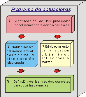 Para la elaboración de los programas de actuación se ha seguido un esquema lógico que se apoya en el diagnóstico realizado con anterioridad, para encaminarse a una situación objetivo deseable. Este esquema responde a una serie de etapas sobre cada área de actuación a desarrollar que se indican en la Fig.3.