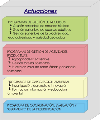 Las actuaciones que se han propuesto dentro del Plan Andaluz de Control de la Desertificación se distribuyen en unos programas de actuación organizados en tres grandes grupos: gestión de recursos, gestión sostenible de actividades productivas y capacitación ambiental.