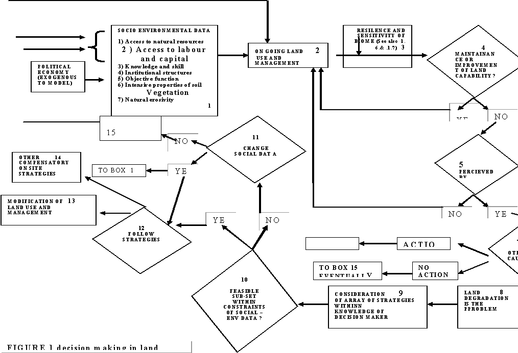 Decision making in land management as earlier hinted is very important. Just who makes the decisions? Several actors are involved in issues of land management and each one has to contribute effectively if desertification has to be combated. Figure 1, based on Blaikie and Brookfield (1987) explains the importance of decision making based on experiences and analysis.