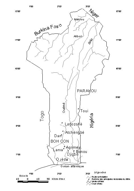La République du Bénin est un pays de l'Afrique de l'ouest. Il est situé entre les latitudes 06° 20' et 12° 30' nord; entre le sixième et le neuvième parallèle nord, il s'étend entre les longitudes 1°30' et 2°45'est; plus au nord, le pays s'élargit entre les longitudes 0°45' et 03°70' est (Adjanohoun et al., 1989) (fig. 1). Selon le travail réalisé par la FAO (1980) sur la cartographie du couvert végétal et ses modifications au Bénin, le pays est composé de trois zones écologiques: