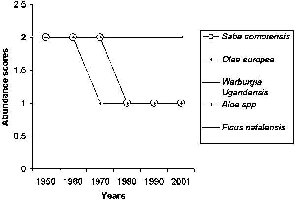 Figure 1a shows Saba comorensis, Olea europea and Aloe spp as decreasing with time, but the latter show the same trend. Warburgia ugandensis and Ficus natalensis are constant, and show the same trend. According to Figure 1b Acacia nilotica, Ximenia americana, Rhus vulgaris meikle and Albizia coriaria show the same trend of constant abundances since 1950 to 2001. The figure also shows that Pittasporium brachcalya is decreasing with time. Besides trends in abundances, the uses of the medicinal plants were established (Table 1).
