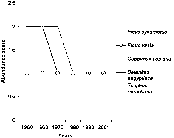 Food plants, such as, Carisa edulis, Vangueria apiculata, Grewia vilosa, Dioscoria bulbbijera, Ficus sycomorus, Balanites aegyptiaca, Ziziphus mauritiana and Capparias sepiaria are decreasing with time, while Ficus vasta has been constant and naturally few. It is believed that the ecology of the forest has not favoured its multiplication. A survey carried out by Traffic/Southern Africa project, found that Balanites aegyptiaca, although wide spread, it is traded in large volumes, and there is a high demand for timber for it. It was reported as a conservation concern in Sudan (MAPRI, 1997). The uses attached to these plants (Table 2), show the likelihood of facing considerable pressure.